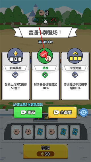 3、抽取后显示普通卡牌,可选择精准等卡牌,也能通过看视频刷新或点击全都要获取卡牌。