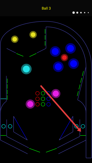 2、游戏过程中,点击屏幕对应位置,弹出铁球进入弹珠台轨道,通过碰撞彩色圆球获取分数,探索轨道布局。