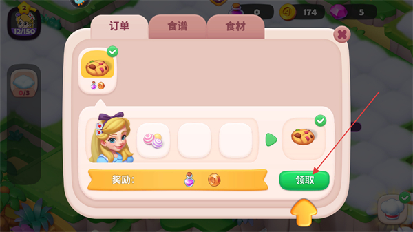 1、查看订单任务需提交指定糖果,点击订单界面的领取,获取任务道具。