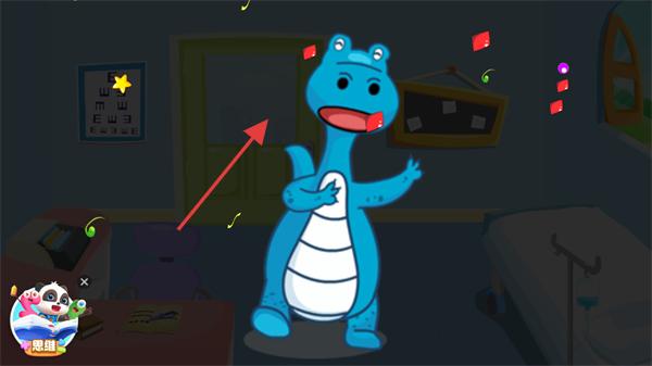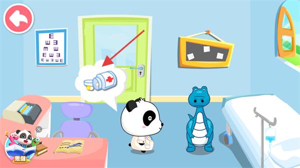 2、进入诊室后,根据熊猫医生的药品提示,准备对应道具,协助治疗恐龙患者。
