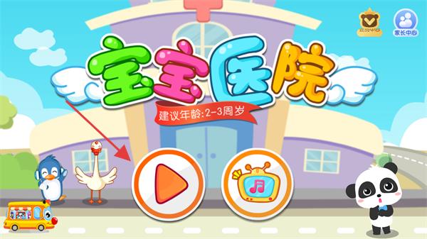 1、点击主界面的橙色播放按钮,进入宝宝医院游戏,该游戏建议年龄2-3周岁。