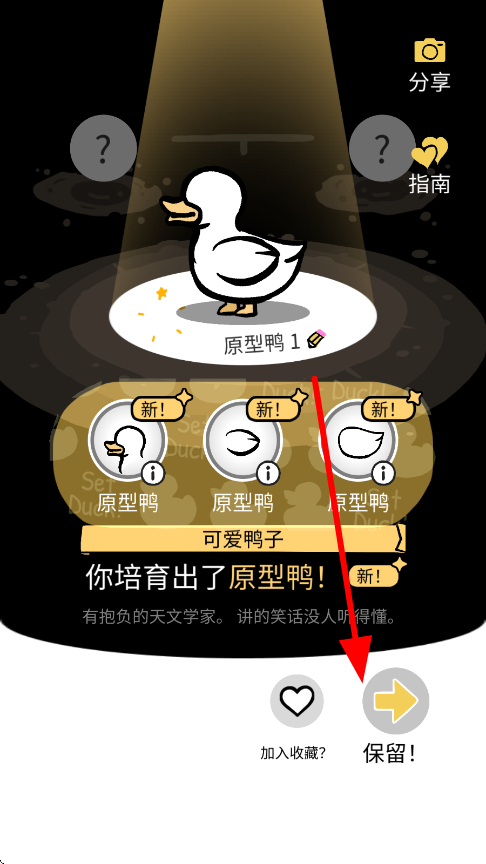 2、鸭蛋成功孵化出鸭子后,像孵化出原型鸭时,界面会展示鸭子形象及相关介绍,此时可选择保留,将这只鸭子留存下来,用于后续的培育等操作。