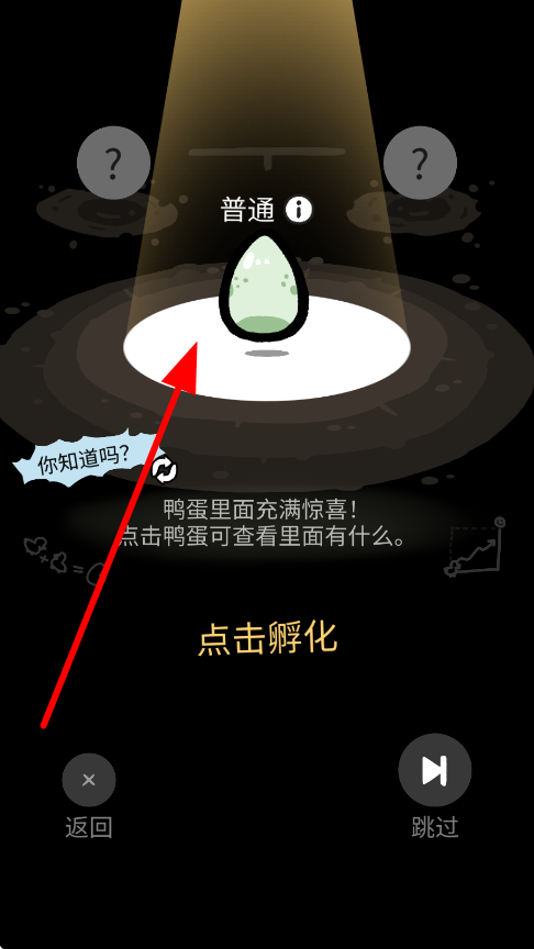 1、开局会看到处于鸭窝里面的小鸭下的鸭蛋,界面提示鸭蛋里充满惊喜,可以点击孵化,就能开启鸭蛋孵化过程,等待孵化出属于你独一无二的鸭子。