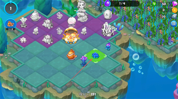 3、将相同的紫色植物移动到绿色区域进行合并,生成更高等级的植物。