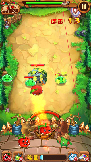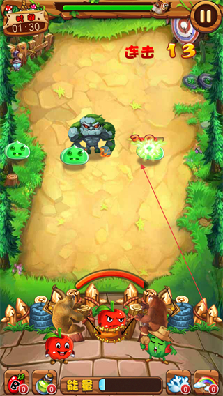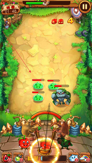 2、调整弹射角度,发射子弹攻击绿色史莱姆等怪物,达成连击如连击4。