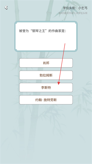 2、题目问被誉为钢琴之王的作曲家是,选择李斯特即可答对题。