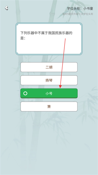 4、题目问下列乐器中不属于我国民族乐器的是,选择小号即可答对题。