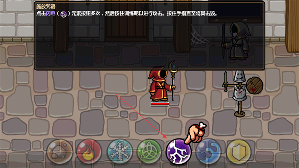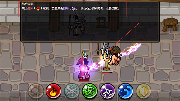3、以闪电魔法为例,点击对应元素按钮多次积累能量,再按住训练靶即可持续释放魔法直至击毁目标。