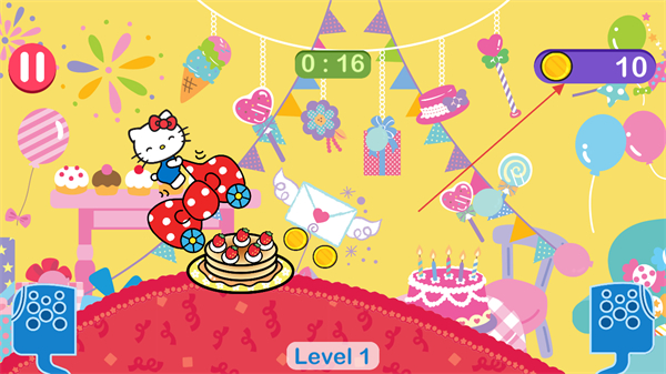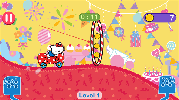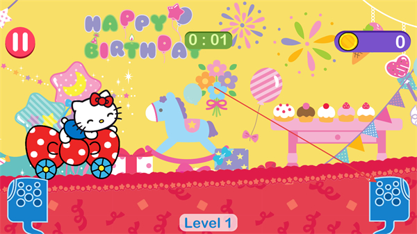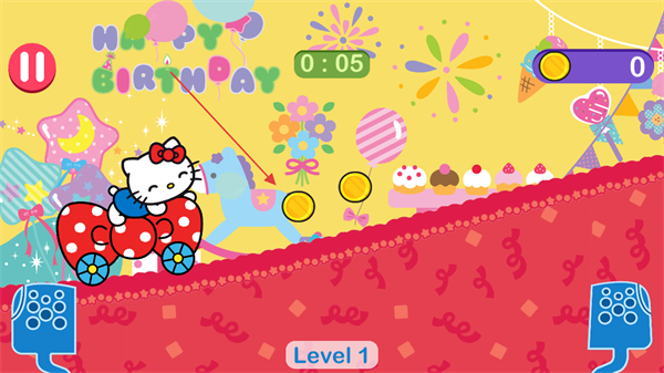 1、操控凯蒂猫驾驶小车在生日主题跑道上行驶,注意时间限制,收集金币。
