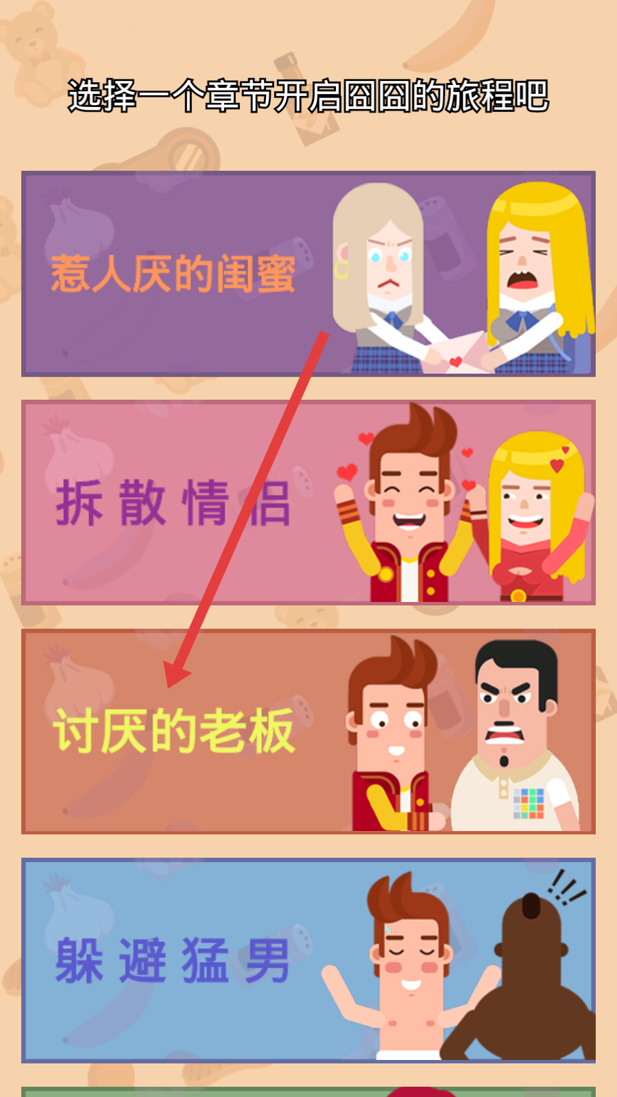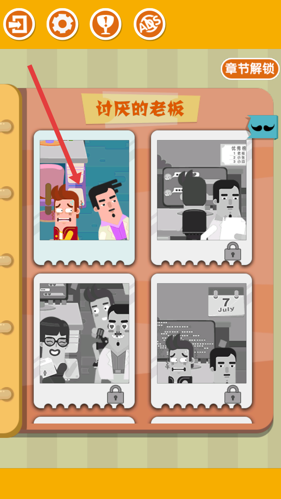 2、在游戏章节列表中,例如可以选定讨厌的老板章节,下一步开启对应主题关卡旅程,体验游戏趣味。