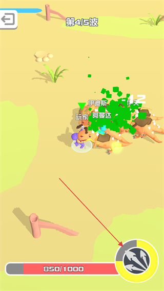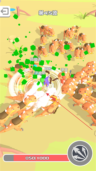 3、到第4/5波,怪物数量增多,触发技能特效范围攻击,同时注意角色血量850/1000。
