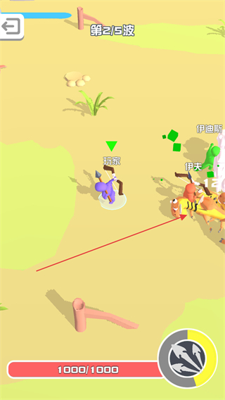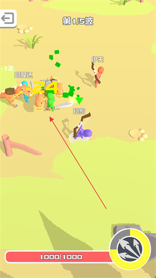 1、处于第1/5波,操控玩家角色,与队友伊夫阿曼达共同攻击怪物,积累战斗进度。