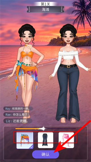 4、在海滩关卡中,选择合适服饰后点击确认按钮,完成穿搭并参与比拼。