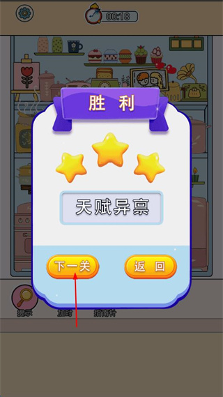 4、完成当前关卡的物品归位后,点击胜利弹窗中的下一关按钮,进入后续关卡。