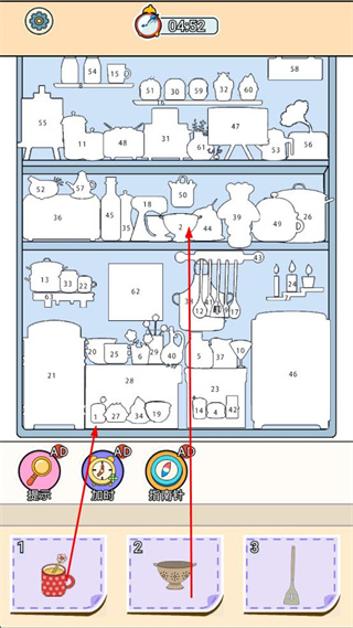 3、根据下方提示的物品,在货架区域找到对应物品并完成归位操作,注意计时进度。