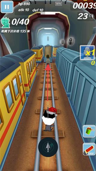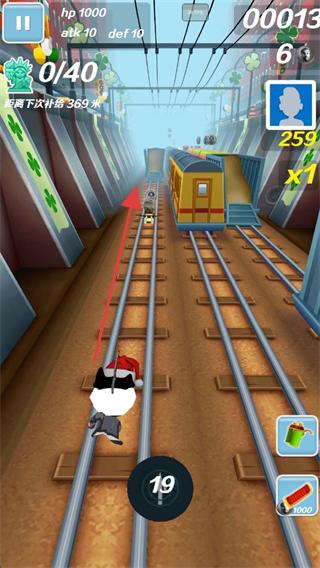 1、沿轨道奔跑,收集头像道具累计0/40进度,避开列车障碍,右侧饮料可恢复hp,持续推进距离。
