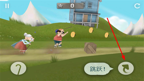 1、进入关卡后老奶奶自动滑行,在奔跑过程中需时刻留意前方出现的车辆、石块等障碍,及时点击跳跃键避免碰撞。
