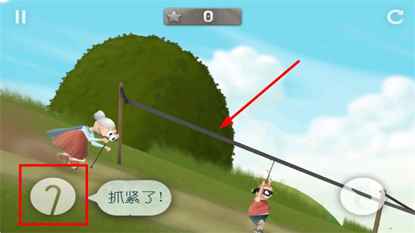 3、场景中会出现索道,点击左侧按钮,使用拐杖勾住钩锁滑行,期间需保持按住按钮,直至滑行结束。