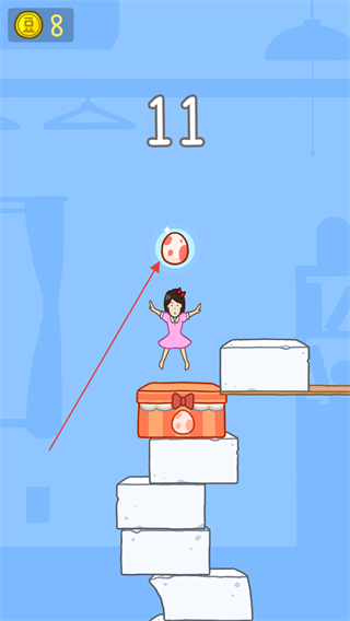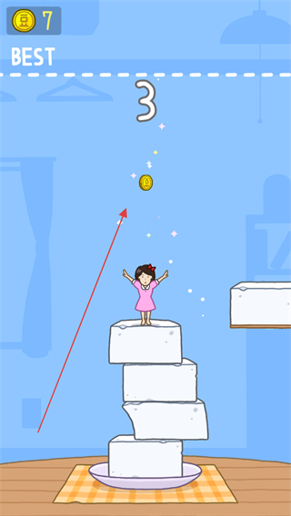 1、操控女孩跳跃豆腐,上方数字显示3,收集空中金币,积累层数同时获取资源。