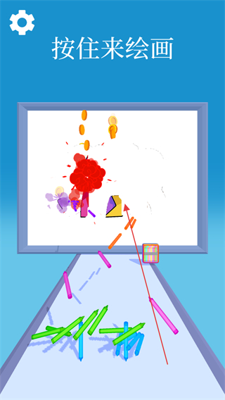 4、抵达画板区域,按住操作触发绘画,利用收集的彩色笔在画板上创作,完成关卡流程。