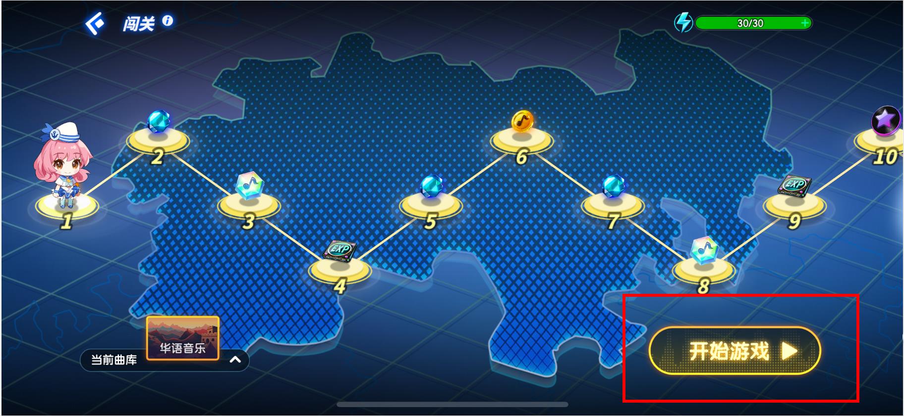 1、点击闯关界面的开始游戏按钮,进入关卡选择。