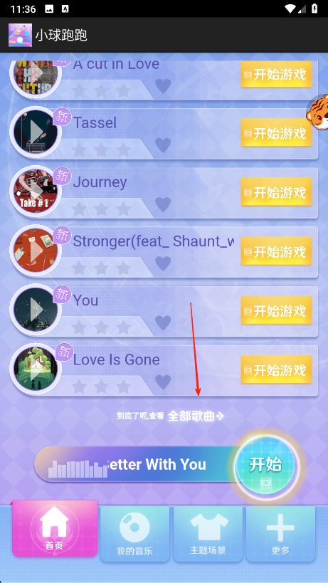 3、若列表没有心仪歌曲,滑动页面到最下方,点击全部歌曲,在完整曲库中选择歌曲,点击开始游戏即可。