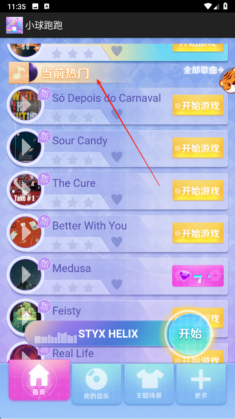 2、在歌曲选择界面,查看当前热门歌曲列表,找到想玩的歌曲,点击右侧开始游戏按钮。