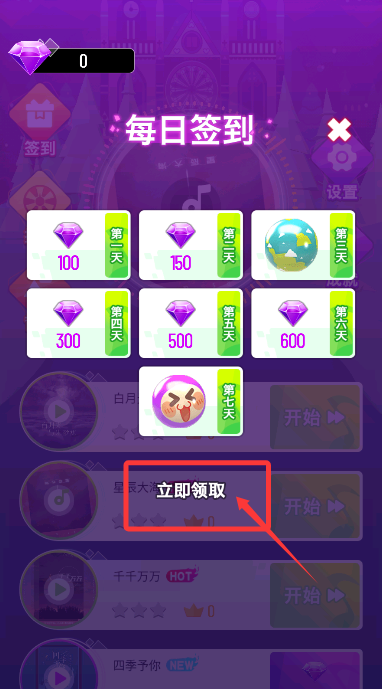 1、登录游戏后,先进入每日福利页面,点击领取按钮获得宝石等奖励。