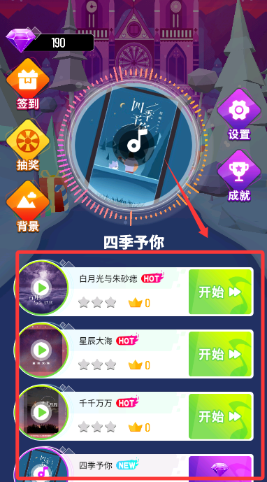 3、在音乐库中选择想玩的曲目,比如星辰大海、千千万万等热门歌曲。