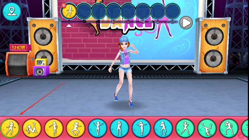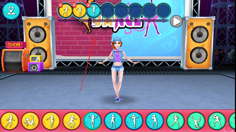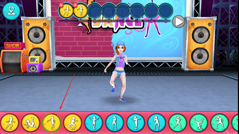 2、下方出现对应舞蹈动作按钮时,按上方圆圈内动作顺序,点击相应按钮,让角色做出正确舞蹈动作。