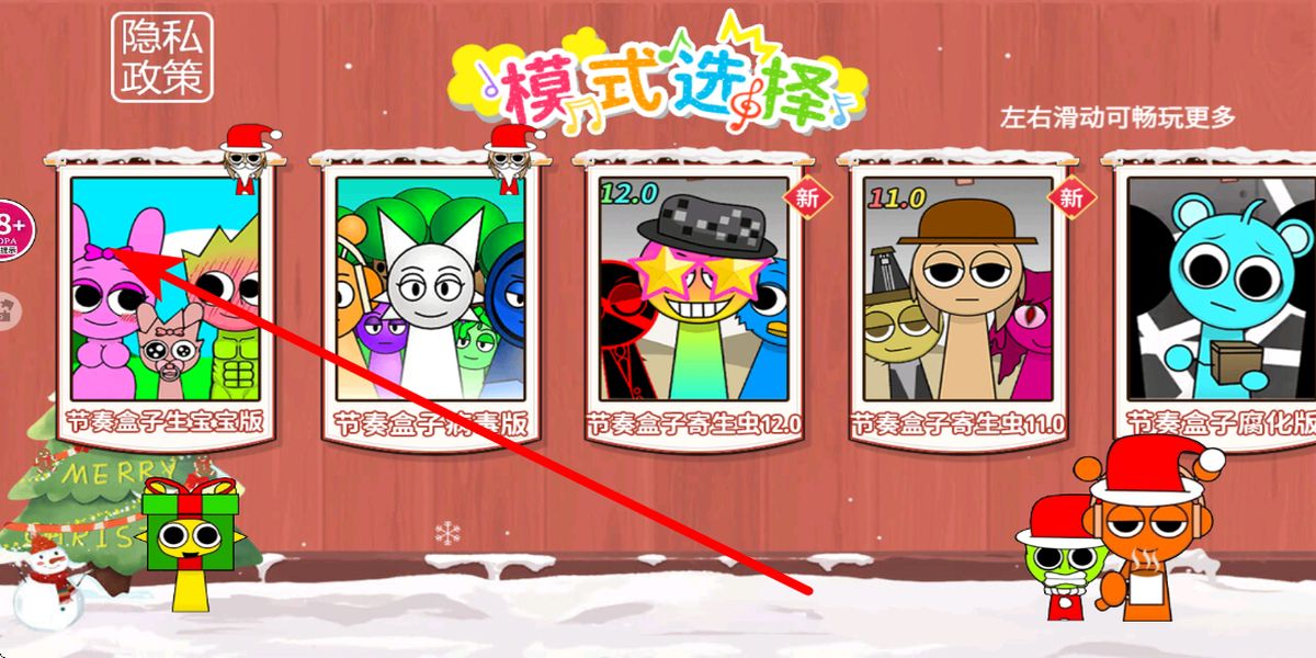 1、进入界面,点击开始游戏,跳转模式选择页面,左右滑动查看模式,像节奏盒子寄生虫版等,了解各模式主题与风格,为创作打基础。