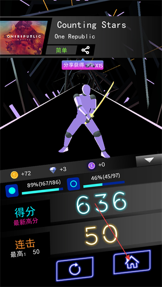 4、歌曲演奏结束,查看得分界面,了解得分,连击最高等数据,点击返回按钮回到主界面。