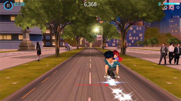 1、游戏开始,操控角色在道路上滑行,留意屏幕上方的倒计时如02:39和分数如-6,368。
