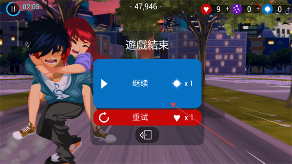 4、若游戏结束,出现遊戲結束界面,点击继续消耗钻石续关,或点击重试重新开始游戏。