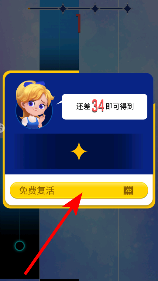 2、弹奏过程中若出现失误导致挑战受阻,可选择免费复活,通过相应操作就能重新继续当前歌曲的弹奏,争取更好的表现。