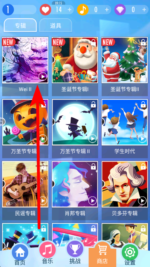 4、前往商店后,能看到众多音乐专辑,如万圣节专辑、肖邦专辑等,可选择购买喜欢的专辑,获取更多可弹奏的音乐。