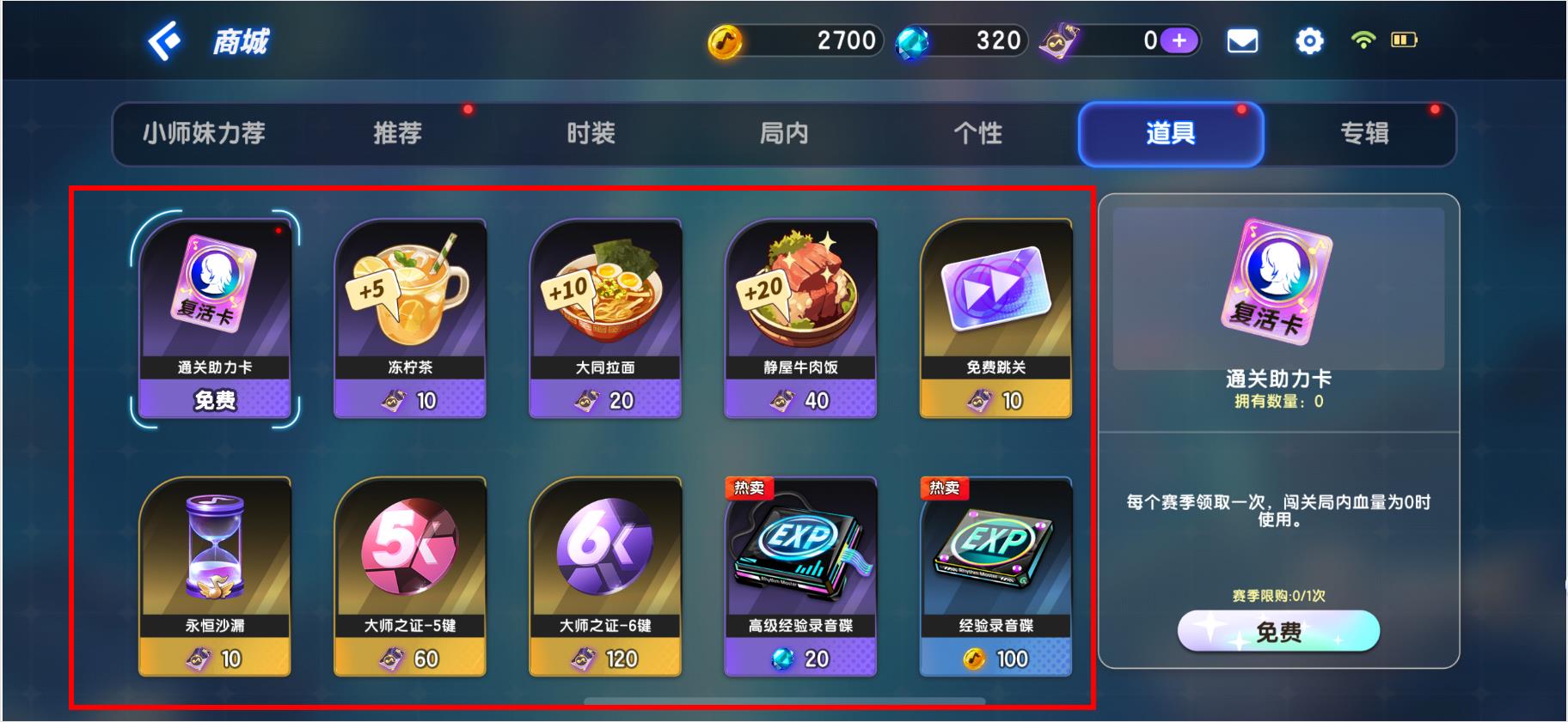 3、在道具页面,可看到多种道具,如复活卡、冻柠茶等。