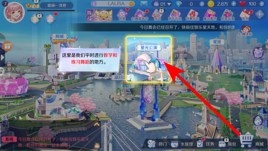 2、新手玩家进入演出场地需在主界面,选择星光公演,进入到用于教学和练习舞蹈的场地,为接下来的舞蹈演出做好准备。