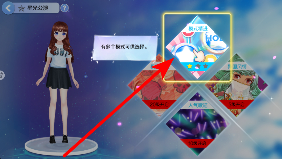 3、挑选演出模式要在星光公演界面,从多个可供选择的模式中,挑选想要体验的演出模式,之后进入该模式的演出环节。