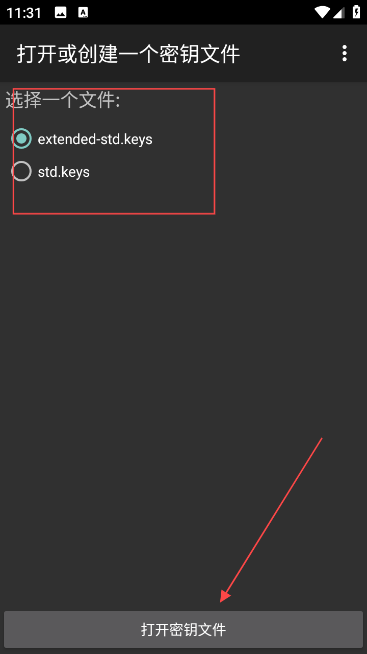 2、进入打开或创建密钥文件页面,选择一个已有的密钥文件,然后点击打开密钥文件,进入密钥编辑器页面即可。