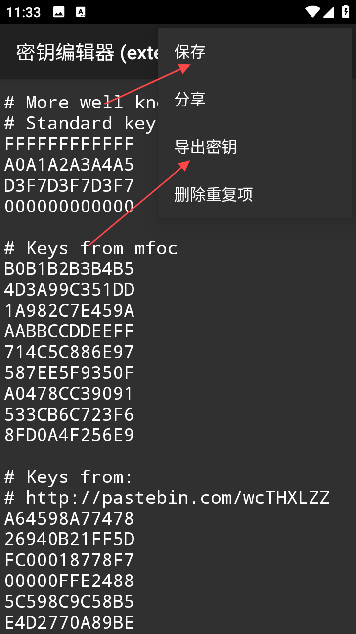 3、可对密钥进行编辑操作 ,编辑完成后点击右上角的三点图标,在弹出的菜单中选择保存,可将修改后的密钥文件保存下来,选择导出密钥。