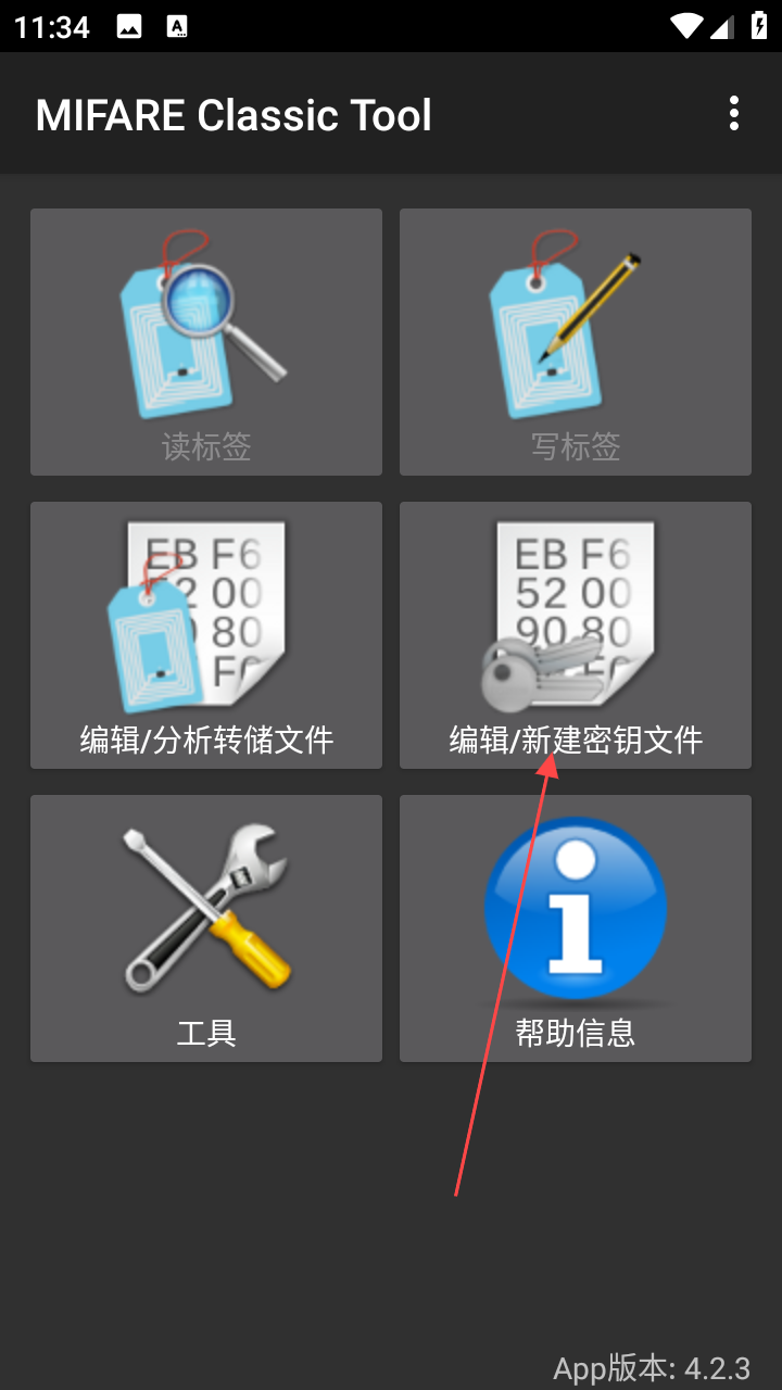 1、打开MIFARE Classic Tool应用进入主界面,点击编辑/新建密钥文件选项,进入选择密钥的界面。