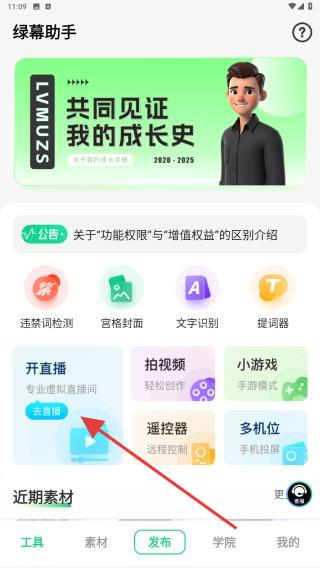 1、打开绿幕助手APP,点击主页内开直播的功能按钮。
