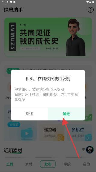 2、点击后,会弹出相机、存储权限使用说明,可点击确定的按钮。