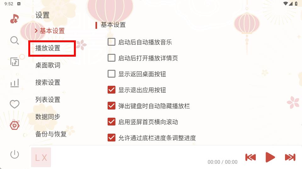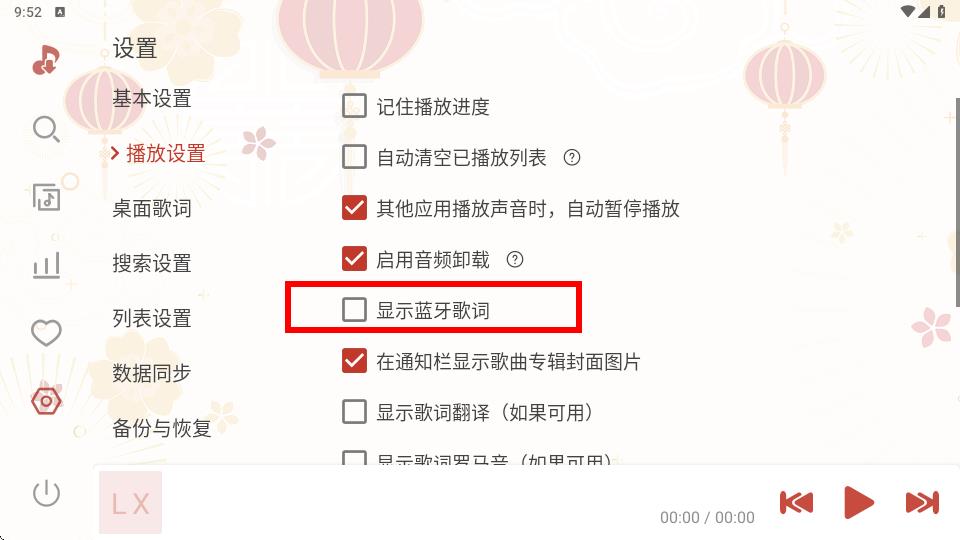 3、在播放设置界面中找到显示蓝牙歌词选项,勾选该选项,即可设置显示蓝牙歌词。