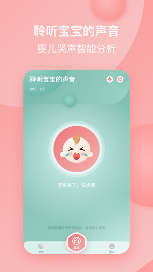 4、宝宝哭声翻译器可辨识新生儿的哭声,帮助父母了解婴儿的哭闹原因。