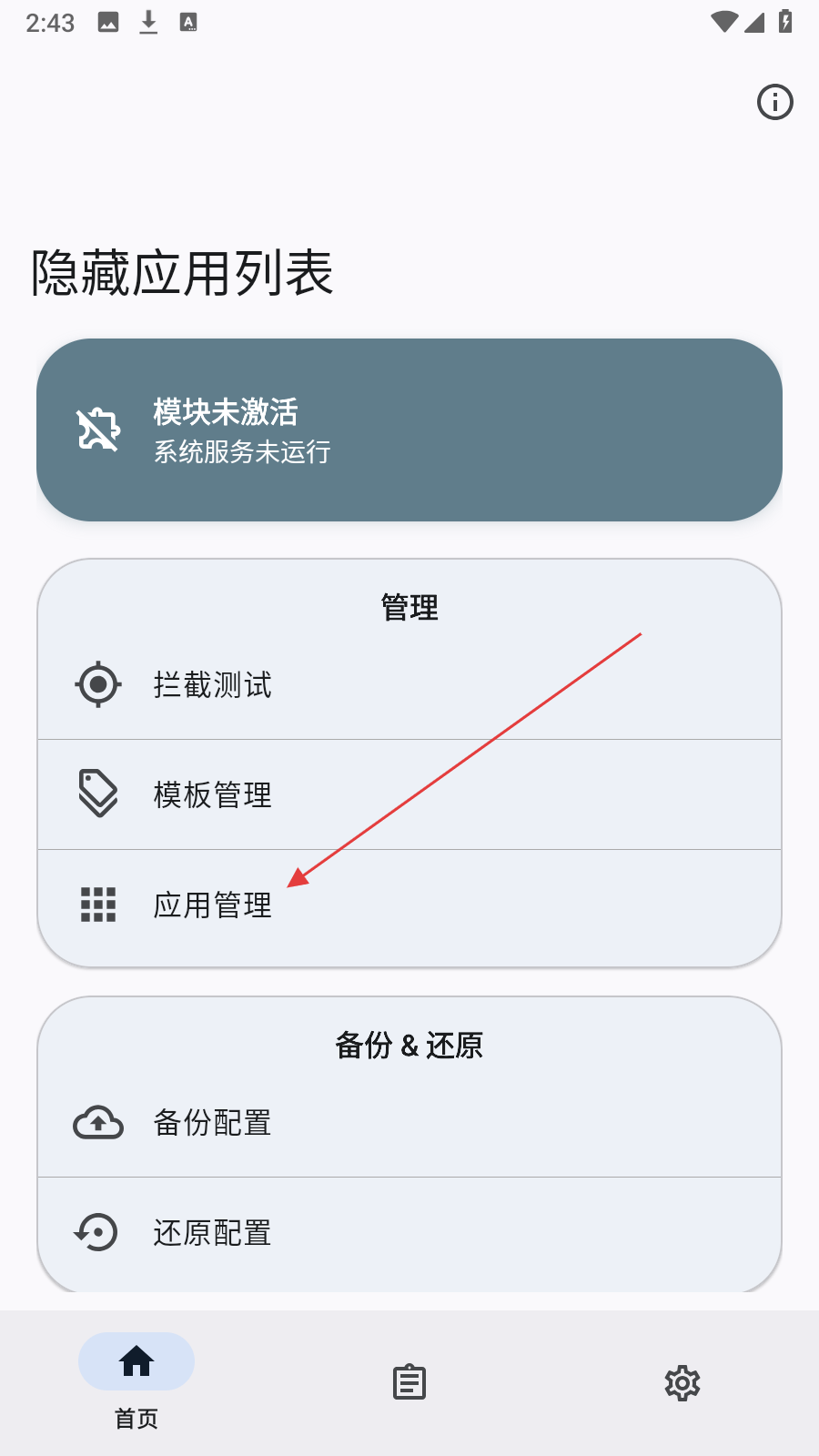 1、打开隐藏应用列表应用,点击应用管理这一选项。