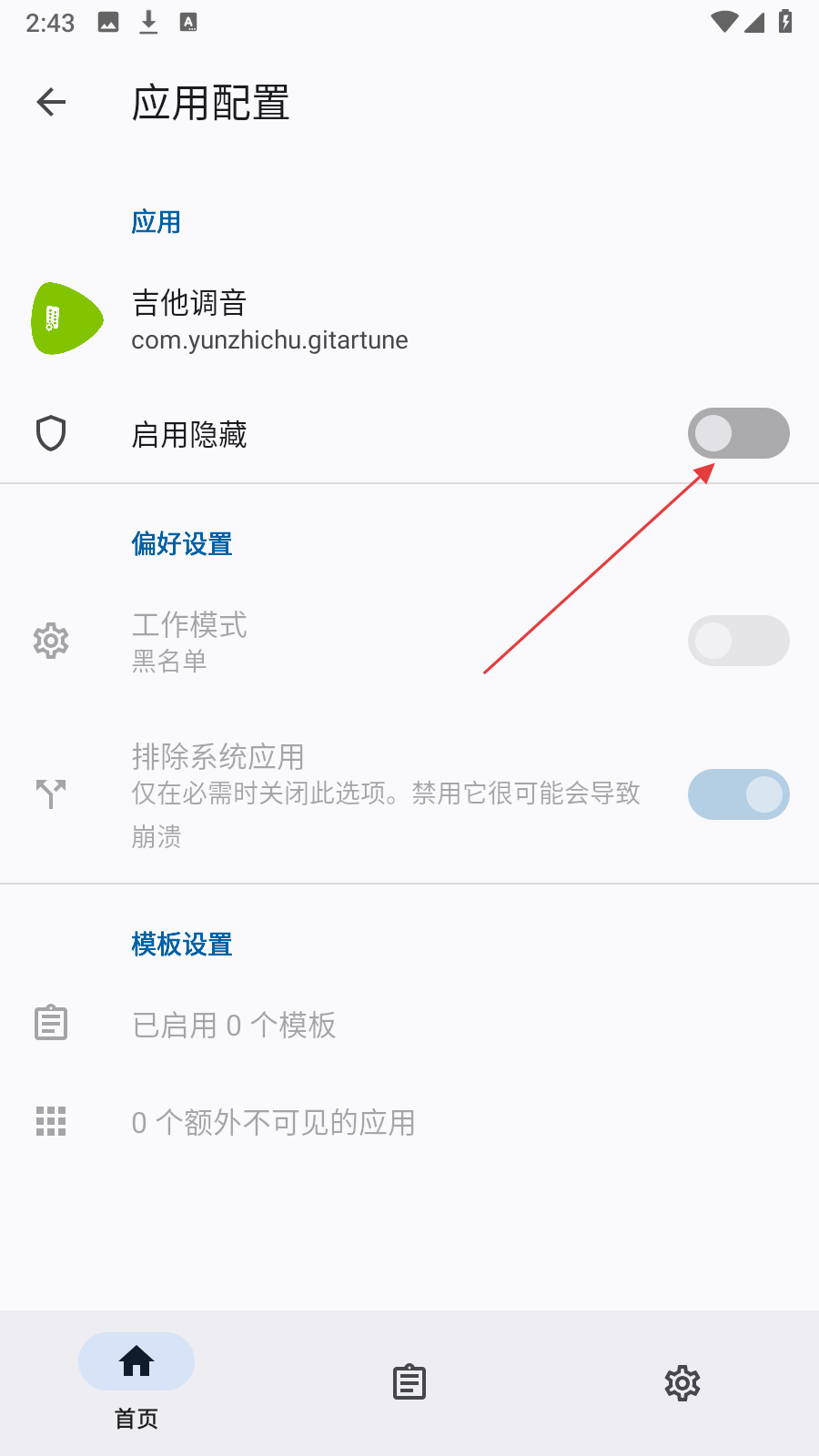 3、在应用配置里找到启用隐藏这一按钮,开启之后应用即可被隐藏。