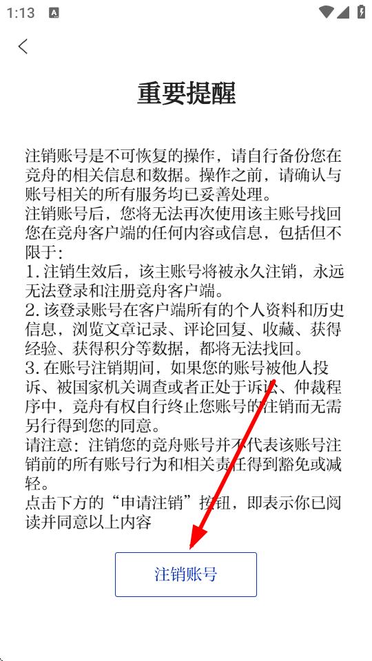 4、仔细阅读重要提醒内容,确认注销账号的后果后,点击下方的注销账号按钮,按照提示完成账号注销操作。