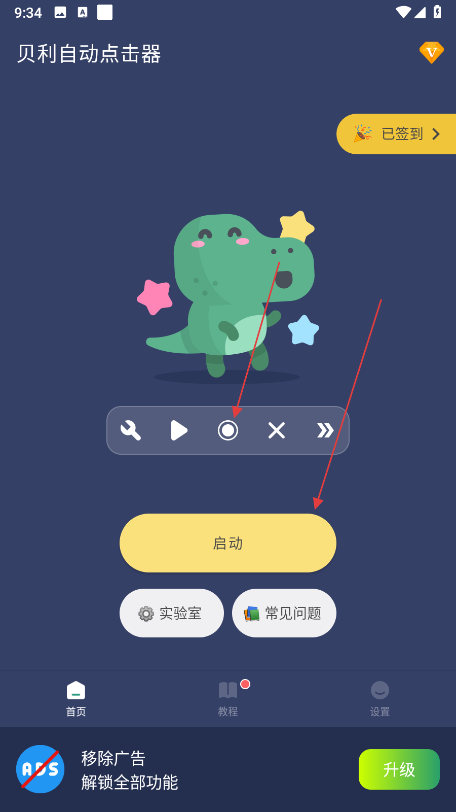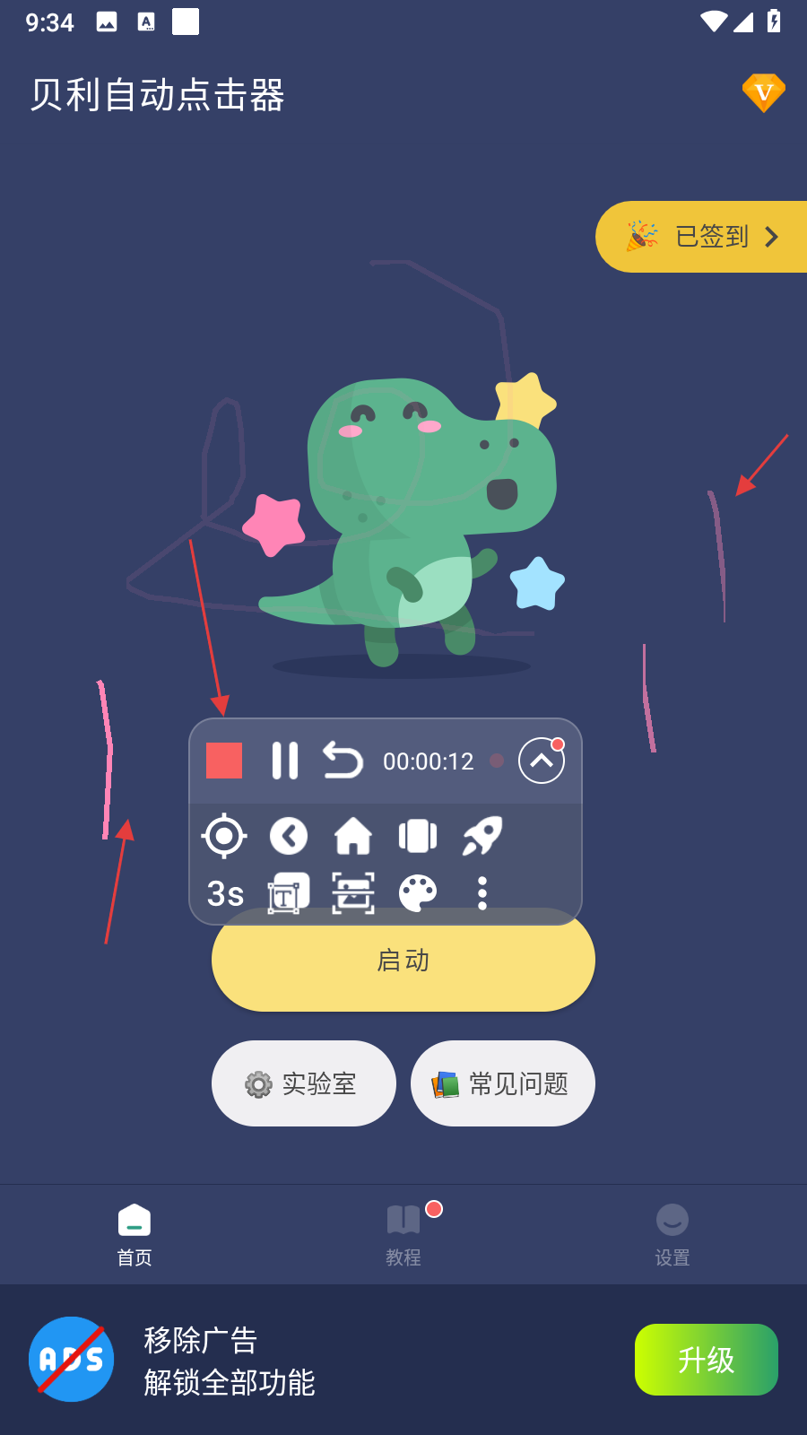 1、打开贝利自动点击器应用,点击主界面中间黄色启动按钮,启动悬浮控制栏,点击中间的白色圆形按钮。